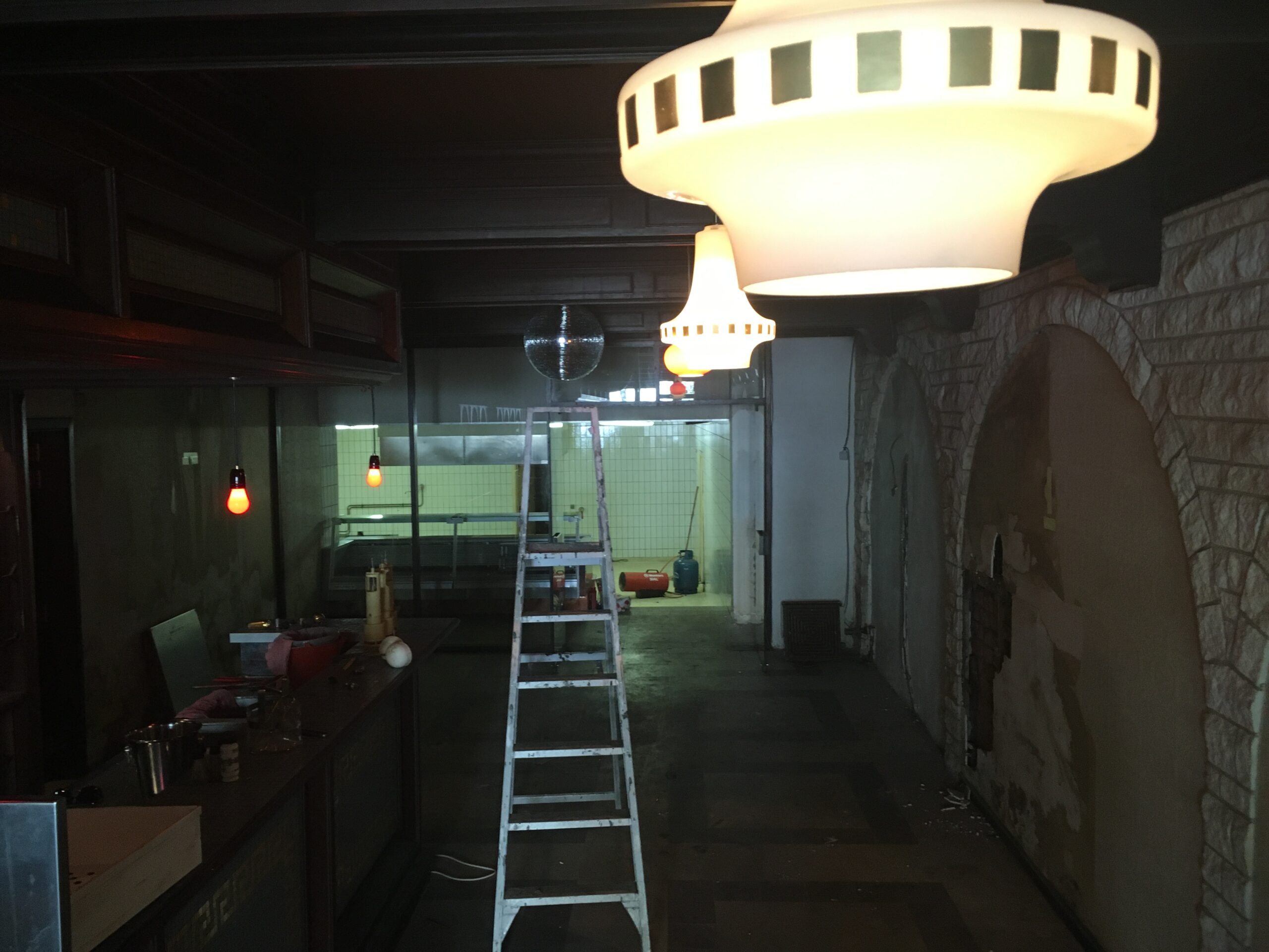 Drinnen ist es dunkel und kühl. Ein Kofferradio dudelt. Der Strom scheint also zu funktionieren. „Sind die Lampen okay oder zu rot?“ fragt Jessica und zeigt auf vier schlichte, sattrote Glühbirnen über der Theke. „Mir gefallen sie“, sage ich. Aber von Inneneinrichtung haben Jessica und die etwa zehn anderen vom Team sicher mehr an Ahnung. „Ja, ich mag sie auch. Sie sehen ganz gut aus. Aber irgendwie passen sie dann doch nicht zum Rest hier.“ Der Rest, das sind grau-marmorierte Bodenplatten, weiße Fließen mit goldenen Ornamenten als Thekenverkleidung und Barhocker mit goldenem Samtbezug. Alles in allem alt but true.
